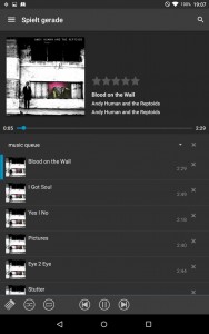 Noch ein kleiner Wehrmutstropfen: Die Datenbanksynchronisierung dauert recht lange bei großen Musikarchiven (bei mir so 1-2 Minuten) und kann nur manuell oder in intervallen gestartet werden . Etwas ärgerlich, wenn man die neu hinzugefügte Musik sofort anhören will.