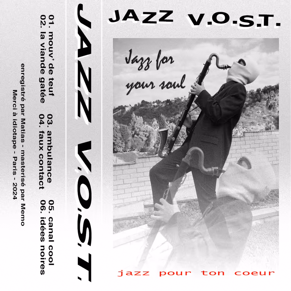 A thorougly mesmerizing load of monotonously pulsing psychedelic post punk bliss with echoes of the proto- and early art punk eras, this new cassette of Paris group Jazz V.O.S.T. comes across a bit like an unholy alliance of Métal Urbain, MX-80 and Chrome, maybe a bit of Swell Maps for good measure… or possibly even a couple of old japanese psychedelic and post punk acts like The Rabbits and early High Rise. All of this gets transferred into some vague semblance of a cold wave context while thankfully eschewing the overly mechanical, formulaic uniformity of what i might consider one of the least creative genres in recent years. No, the pulses, twitches and rumbles on this record aren’t caused by the cold rotations of some interchangeable machine but rather the joy of free expression and humanity of defiant spirits refusing to let themselves get crushed by harsh realities.
