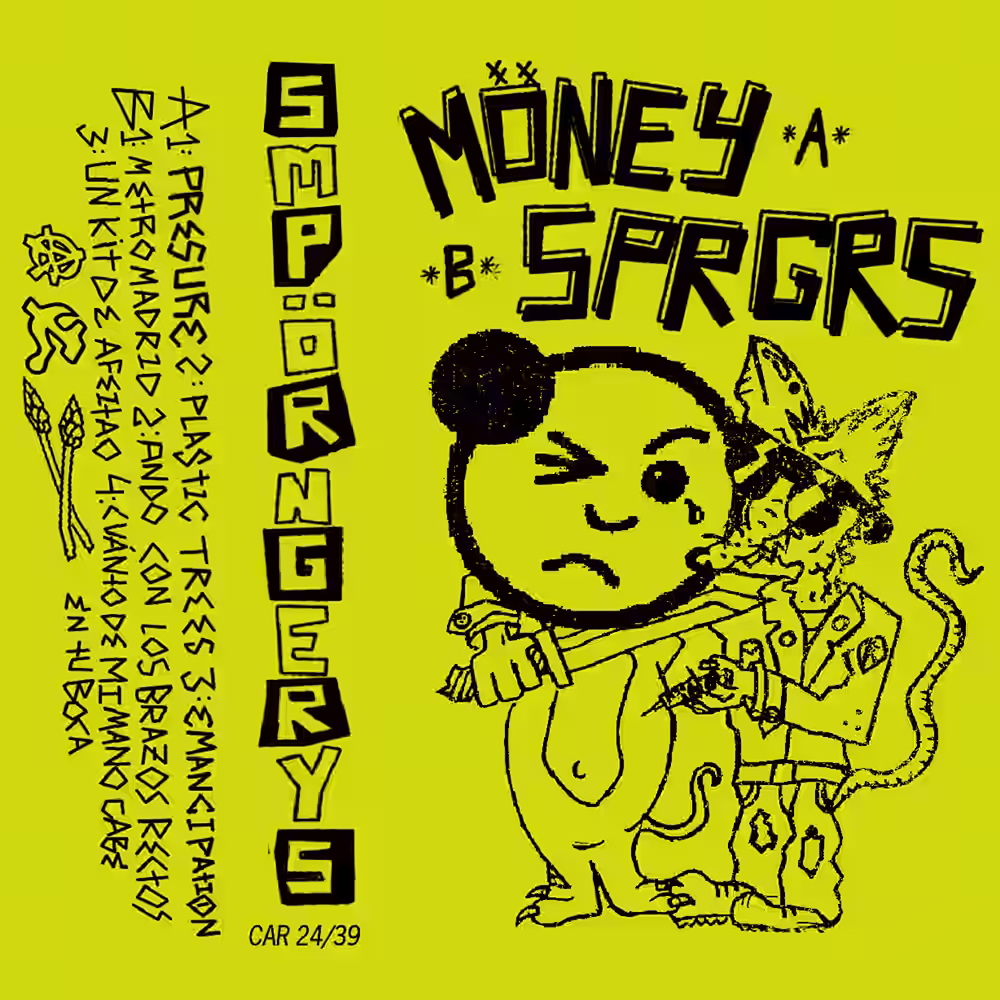 Zwei bislang eher noch etwas am Rand der Szene agierende Akteure der Eggpunk-Welle machen gemeinsame Sache auf dieser netten Split-LP und machen klar, dass man jenen „Unter ferner liefen…“-Status besser noch mal überdenken sollte. Auch wenn hier wie gehabt das Rad nicht neu erfunden wird, haben beide Bands klar ihr Rezept verfeinert. SPRGRS aus Granada, Spanien sorgen dabei schon mal einen ausgezeichneten Start mit ihrer quirlig-pulsierenden und melodischen Herangehensweise ans Genre, die man so ähnlich in jüngerer Zeit etwa von Bands wie Prison Affair, Beer, Paulo Vicious und Goblin Daycare gehört hat. Noch mal ein stärkeres Kaliber sind dann aber die neuen Tracks von Möney aus Bristol, die hier eine recht vielseitige Klangpalette und tadellose Songkonstruktion präsentieren, insgesamt auch durchtränkt von einem Surf- und Psych-lastigen Post Punk-Vibe – besonders prominent im abschließenden Track Emancipation – was insbesondere die Sounds von Electric Prawns 2, Checkpoint, Gremlin und Powerplant ins Gedächtnis ruft. Plastic Trees wiederum ist ein überraschendes kleines Juwel des glitzernden Noise-/Dream-/Powerpops und bekommt einen besonderen Glanz verliehen von einer tollen Gast-Gesangsperformance, die in den Credits einer mysteriösen Miss Clienti zugeschrieben wird.